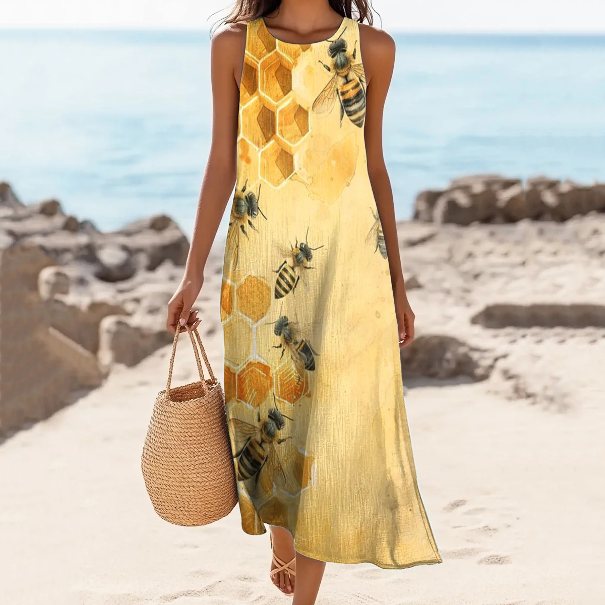 Simpfit Damen-Midikleid aus Nachahmung aus Baumwolle und Leinen mit Rundhalsausschnitt und Bienen-Print im Vintage-Stil