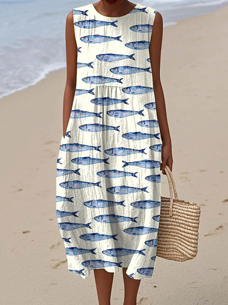 Simpfit Damen-Nachahmung aus Baumwolle und LeinenTankkleid mit süßem Fisch-Kunstdruck