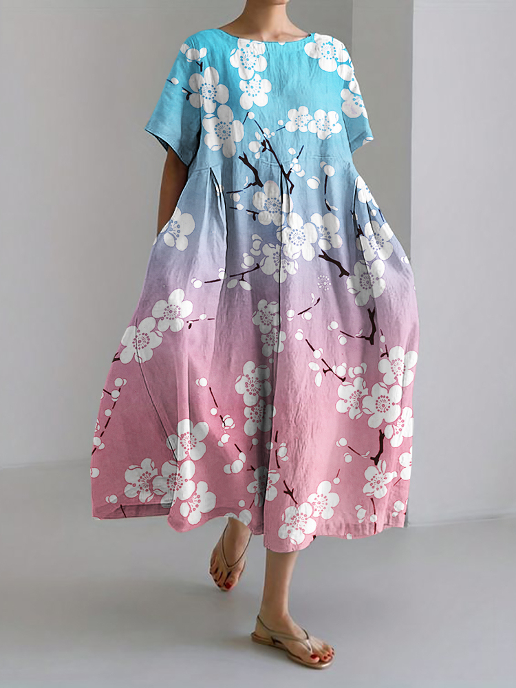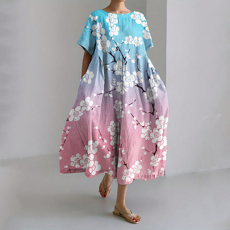 Simpfit Japanisches Pflaumenblüten-Trans-Flaggen-inspiriertes Maxikleid aus Nachahmung aus Baumwolle und Leinen mit Farbverlauf
