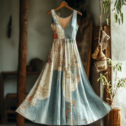 Simpfit Nachahmung aus Baumwolle und Leinen Maxikleid mit alter Landkarte im Vintage-Stil