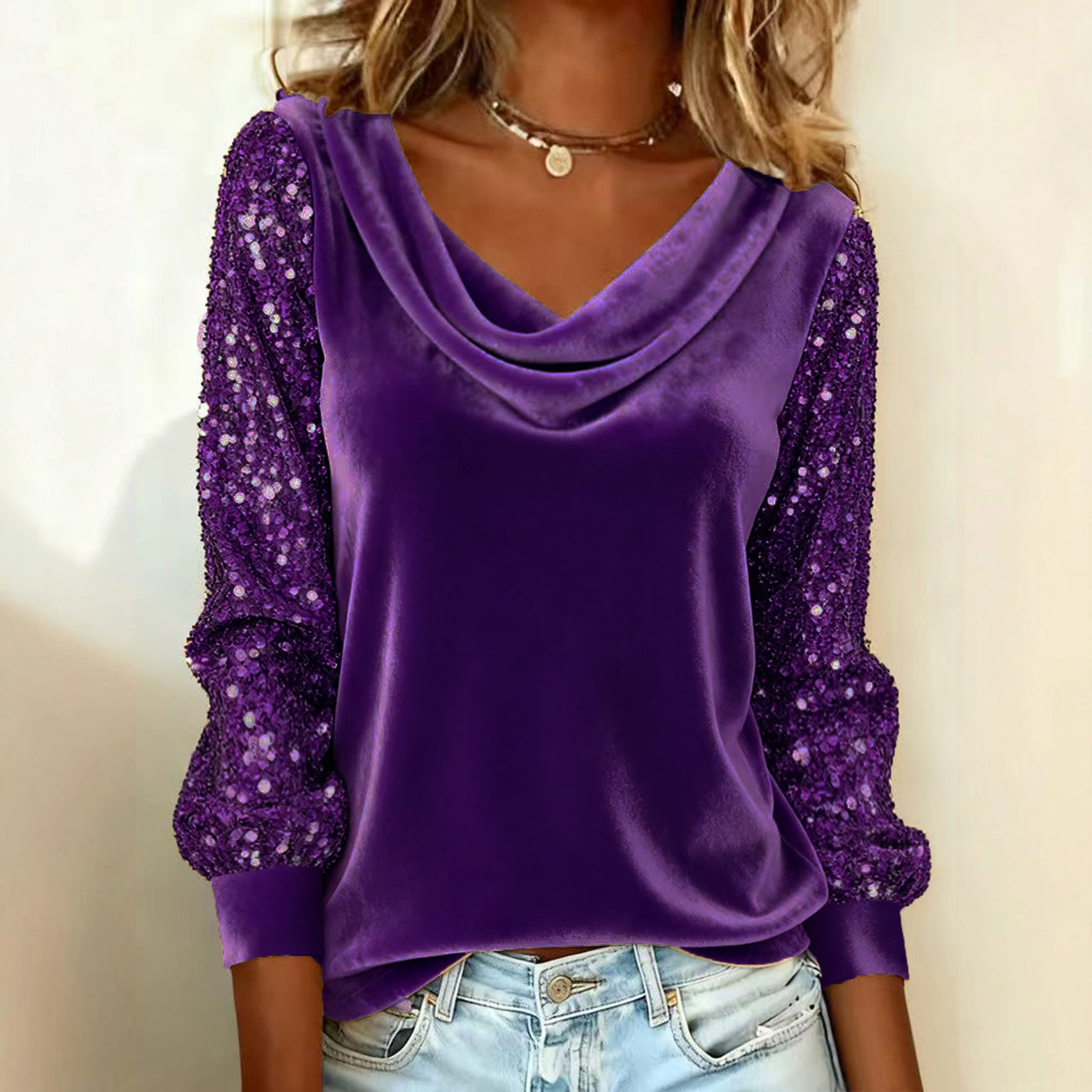 Simpfit Damen-T-Shirt aus Samt mit Stehkragen, Paillettenbesatz und langen Ärmeln