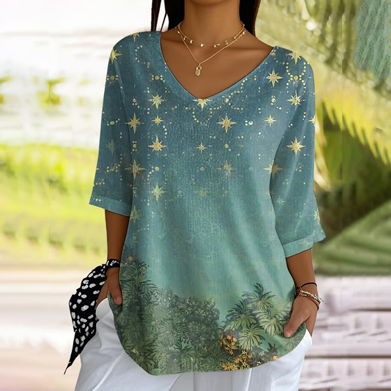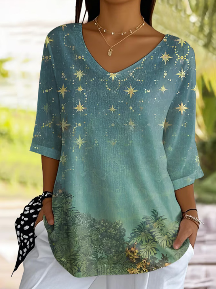 Simpfit Lässiges T-Shirt mit V-Ausschnitt und Wald-Sternenhimmel-Print aus Jacquard-Stoff für Damen